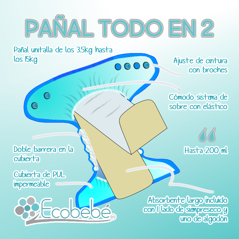 Nuestro pañal Ecobebé te permite sólo cambiar el absorbente que ya incluye cuando tu bebé hace pipí y reutilizar la cubierta con un nuevo absorbente, es unitalla, muy fácil de lavar, tiene doble barrera antiescurrimiento y está elaborado con telas de la mejor calidad y libres de químicos tóxicos.